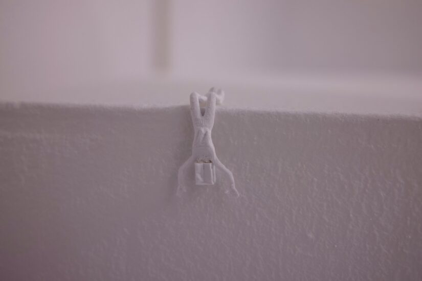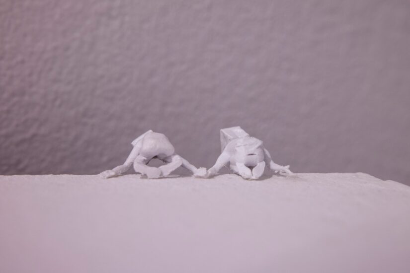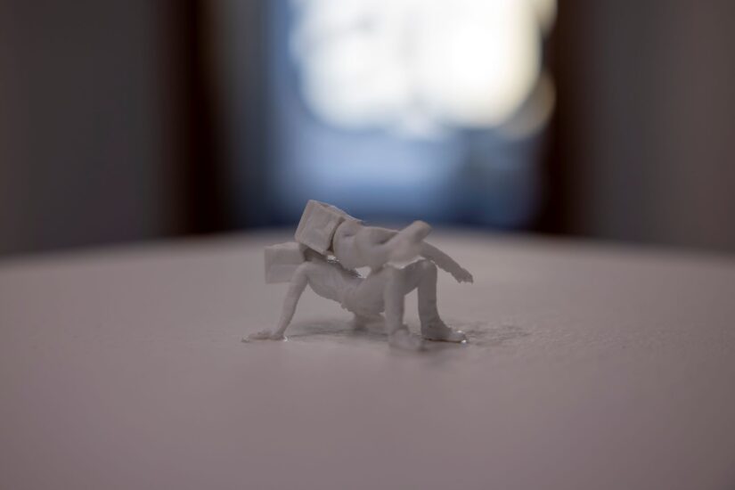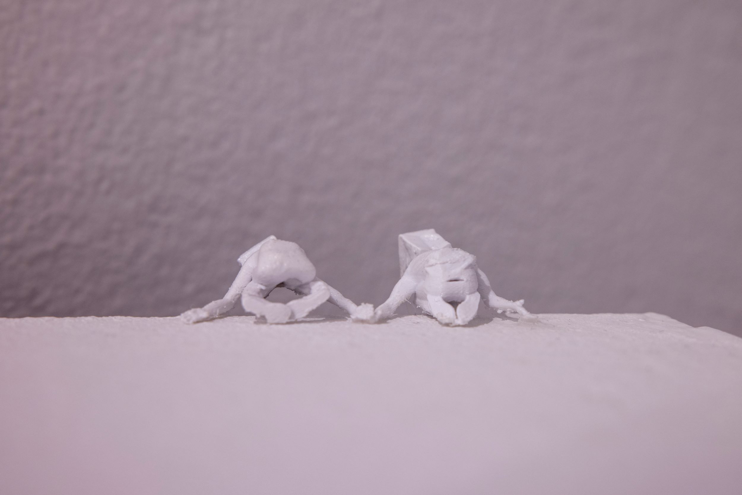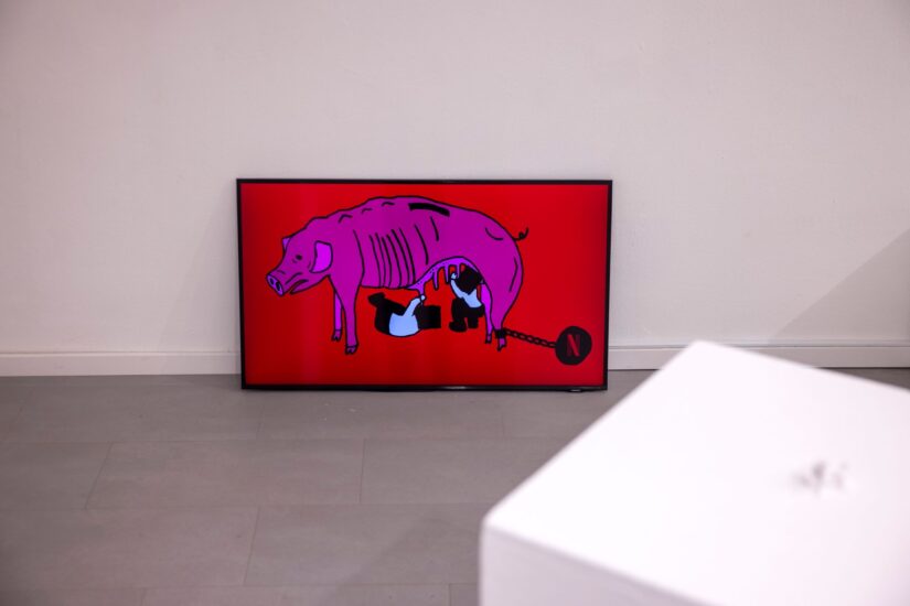 Miyazaki razstavo začne z instalacijo Ljubezen ne plačuje najemnine, v kateri z izhajanjem iz travmatične pozicije ljubezni, ki v zahtevah sodobne družbe razpolaga s skopo odmerjenim časom, tematizira realnost neizprosnega kolesja sodobnega kapitalizma. Sestavljajo jo štiri animacije, 3D tiskane figurice in fotografska povečava. V eni od animacij sta v središču vrtljivo kolo (oko ujame izrisane položnice, ki ga sestavljajo) in par, ki je ujet v ponavljajoč se vrtinec kolesa, nekakšen perpetuum mobile, ki ga vzdržuje njuna energija. V drugi je isti par, ki z vso močjo, kar je premore, potiska kolo v obliki stiskalnice, mu daje ves svoj čas, da bi iztisnil nič. V vseh štirih animacijah se zgolj v nekaj podobah izrisuje zgovorna realnost obstoječega sveta: ujetost v zahtevo nenehne gospodarske rasti ter stalne produktivnosti (in potrošništva), ki jemlje energijo in čas ter prinaša predvsem izčrpanost, medtem ko se dobiček steka drugam. Miyazaki v nadaljevanju instalacije poudari podaljševanje časa, namenjenega delu, in krčenje prostega časa z miniaturnima figuricama para v različnih položajih, ki (prepogosto neuspešno) iščeta idealno prepletenost teles, da bi bližina s pomembnim drugim trajala čim dlje, ter s fotografsko povečavo para, ki obvladuje prostor in skupaj z napisom “ljubezen ne plačuje najemnine” priteguje pogled. S fotografijo in figuricami para umetnica izpostavi razpoko med realnim in željo, ki se vzpostavlja bolj kot iluzija, ki jo je težko doseči, s celotno instalacijo pa poudarja v ironično grenkobo ovito misel: kapitalizmu dajemo vse, svoja življenja, telo, dušo, ljubezen in čas. S podobami ujetosti v kolesje kapitalizma delo napeljuje tudi k razmisleku o široko prisotnem prepričanju, da si je drugačno politično in ekonomsko ureditev, kot je ta, v kateri živimo, težko zamisliti. Zdi se, da je Fisherjeva trditev iz leta 2009 (v knjigi Kapitalistični realizem), da se ljudem odsotnost alternative ne zdi več problematična, ker se je kapitalizem usidral do te mere, da je koloniziral sanjski del misli prebivalstva, kljub pojavu novih ekonomskih oblik in družbenih gibanj v sodobnosti še vedno ali celo bolj aktualna.